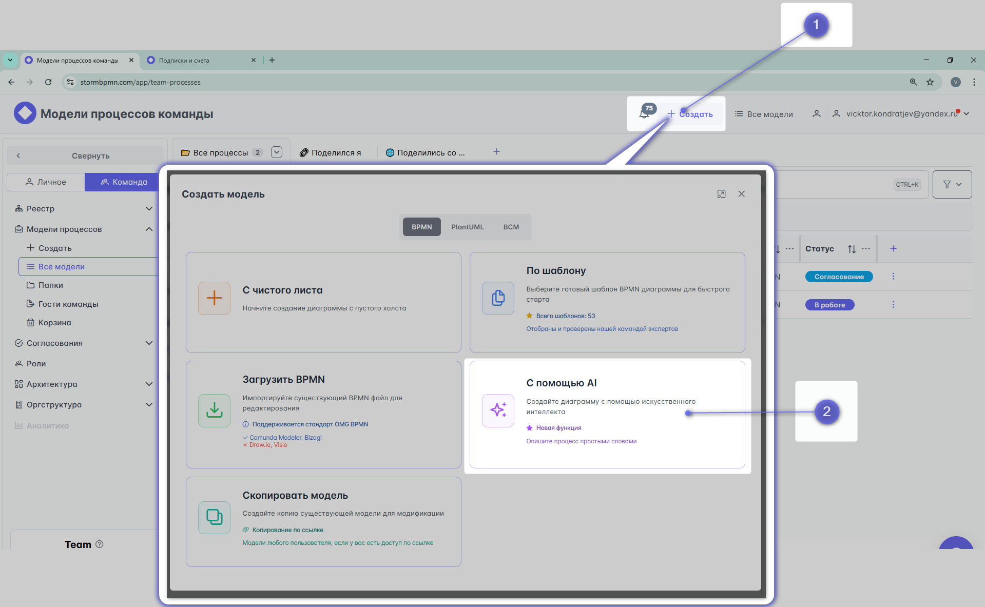 В нашем редакторе BPMN есть возможность использовать помощь искуственного интелекта (ИИ-помощника).
