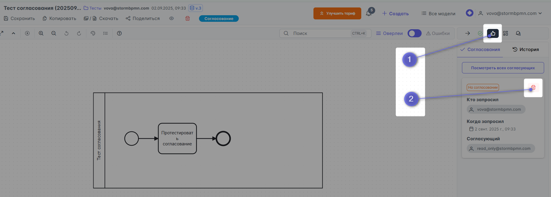 После отправки схемы на согласование диаграмму нельзя будет редактировать или менять её статус, пока не будут получены результаты по ВСЕМ отправленным запросам на согласование.