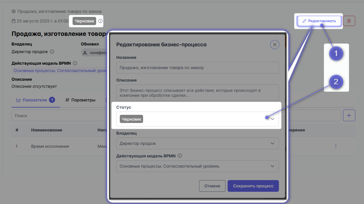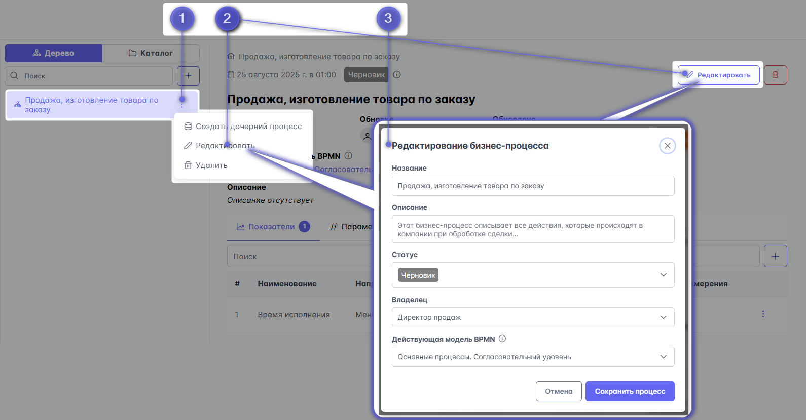 Вызов меню редактирования карточки процесса доступно как из перечня процессов, так и из выбранной карточки