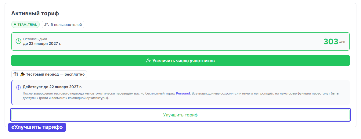 Если у вас активен тестовый период (Team Trial), вы увидите специальное уведомление с датой окончания триала и информацией о том, что произойдёт после его завершения.