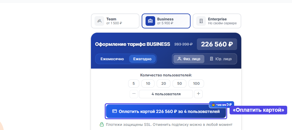 На странице выбора тарифа укажите нужный план (Team, Business или Enterprise), количество участников и период оплаты. После оплаты подписка активируется мгновенно, и все ваши данные снова станут доступны в полном объёме.