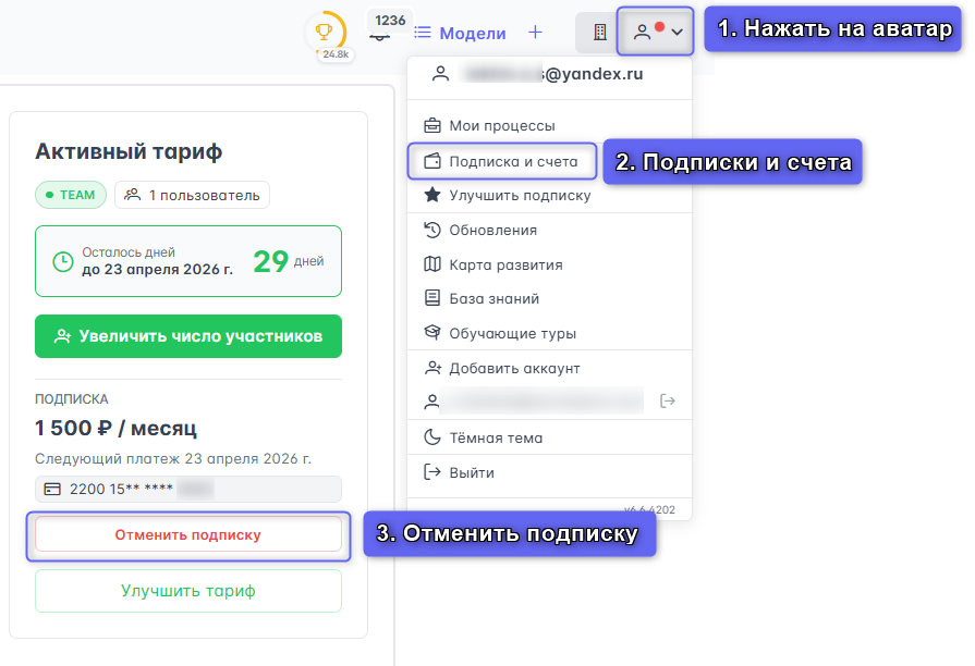 Перейдите на страницу «Подписки и счета» (аватар в правом верхнем углу → «Подписка и счета»)