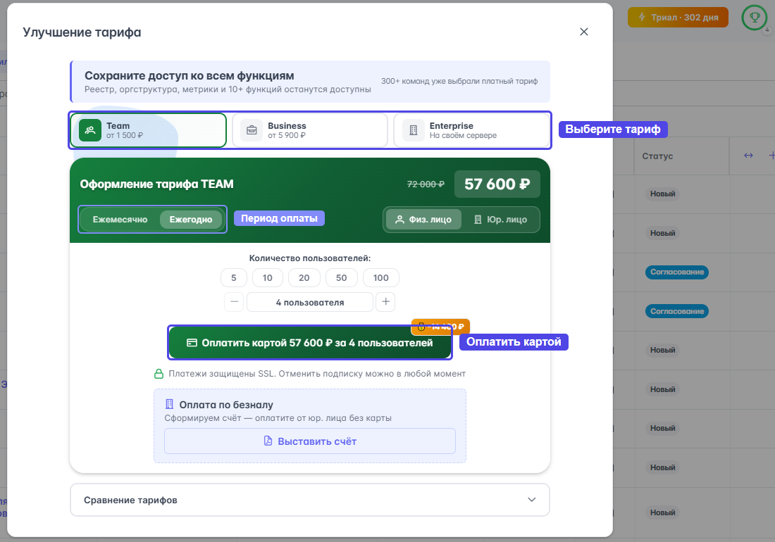 Чтобы перейти на более высокий тариф (например, с Team на Business):