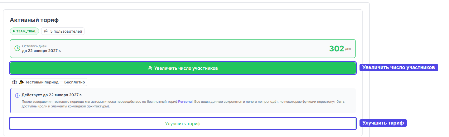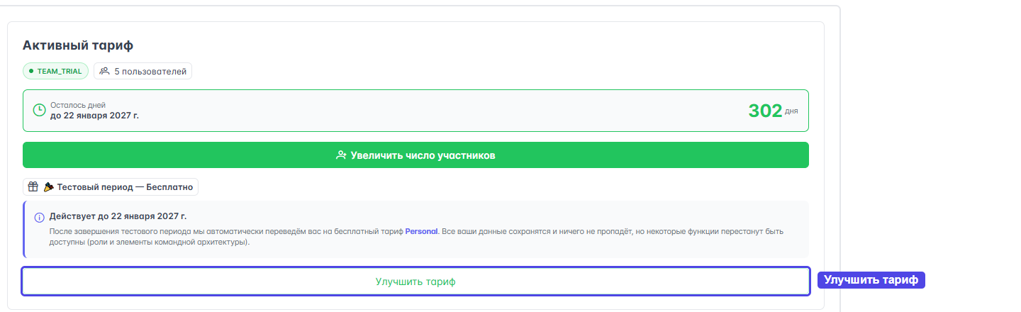 Количество участников — если на новом тарифе лимит участников ниже, чем текущее число членов команды, то система выдаст предупреждение об этом превышении и ограничит доступ к функциям