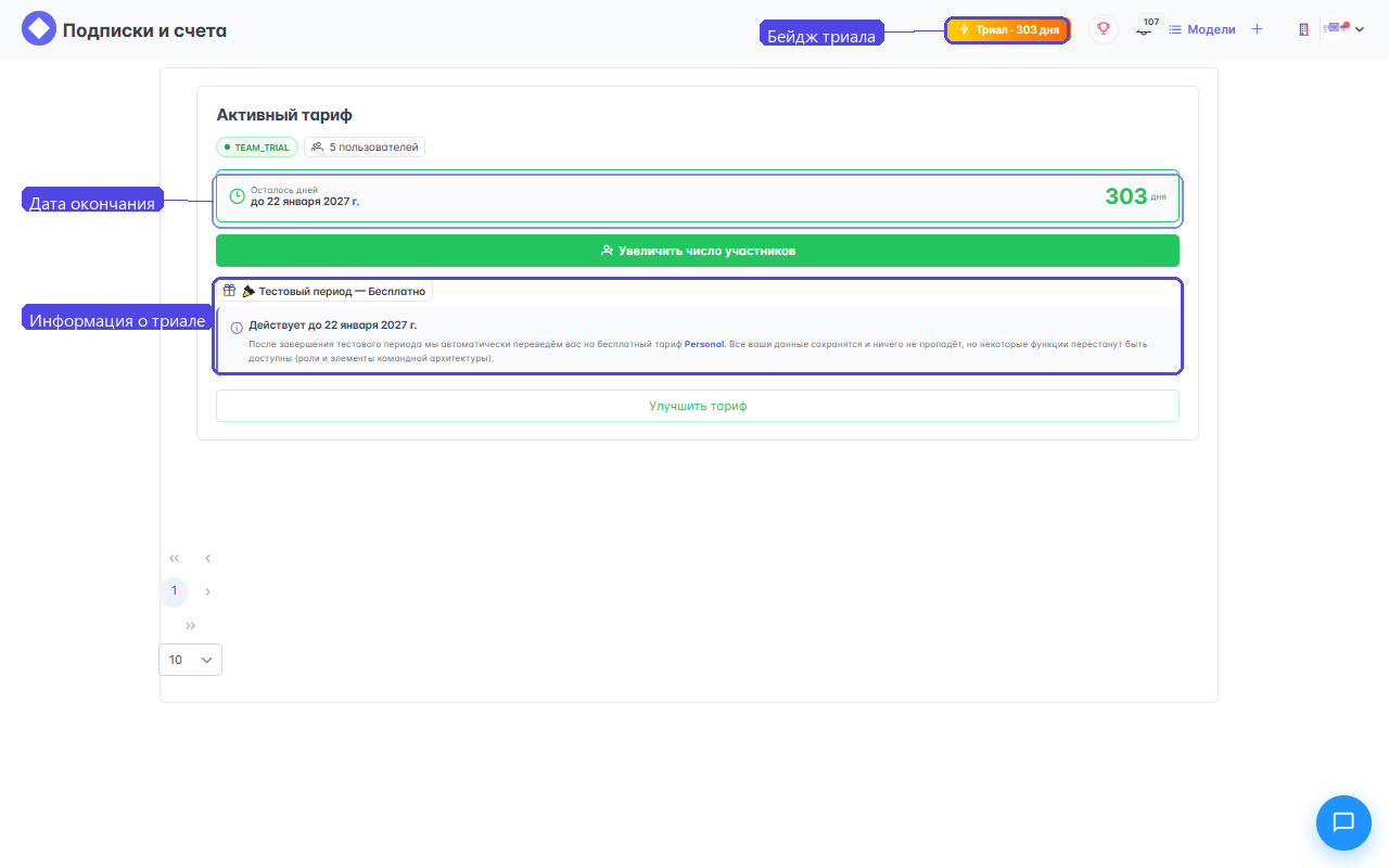 О: После окончания триала командные функции будут недоступны для всех участников. При оформлении платной подписки укажите нужное количество мест — все участники снова получат доступ.