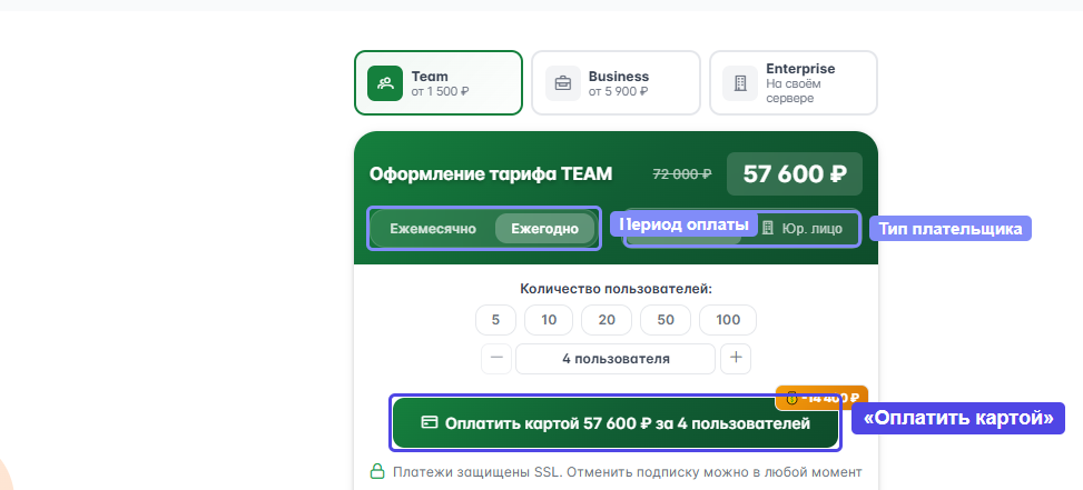 Выберите тариф: Team (от 1 500 ₽/мес) или Business (от 5 900 ₽/мес)