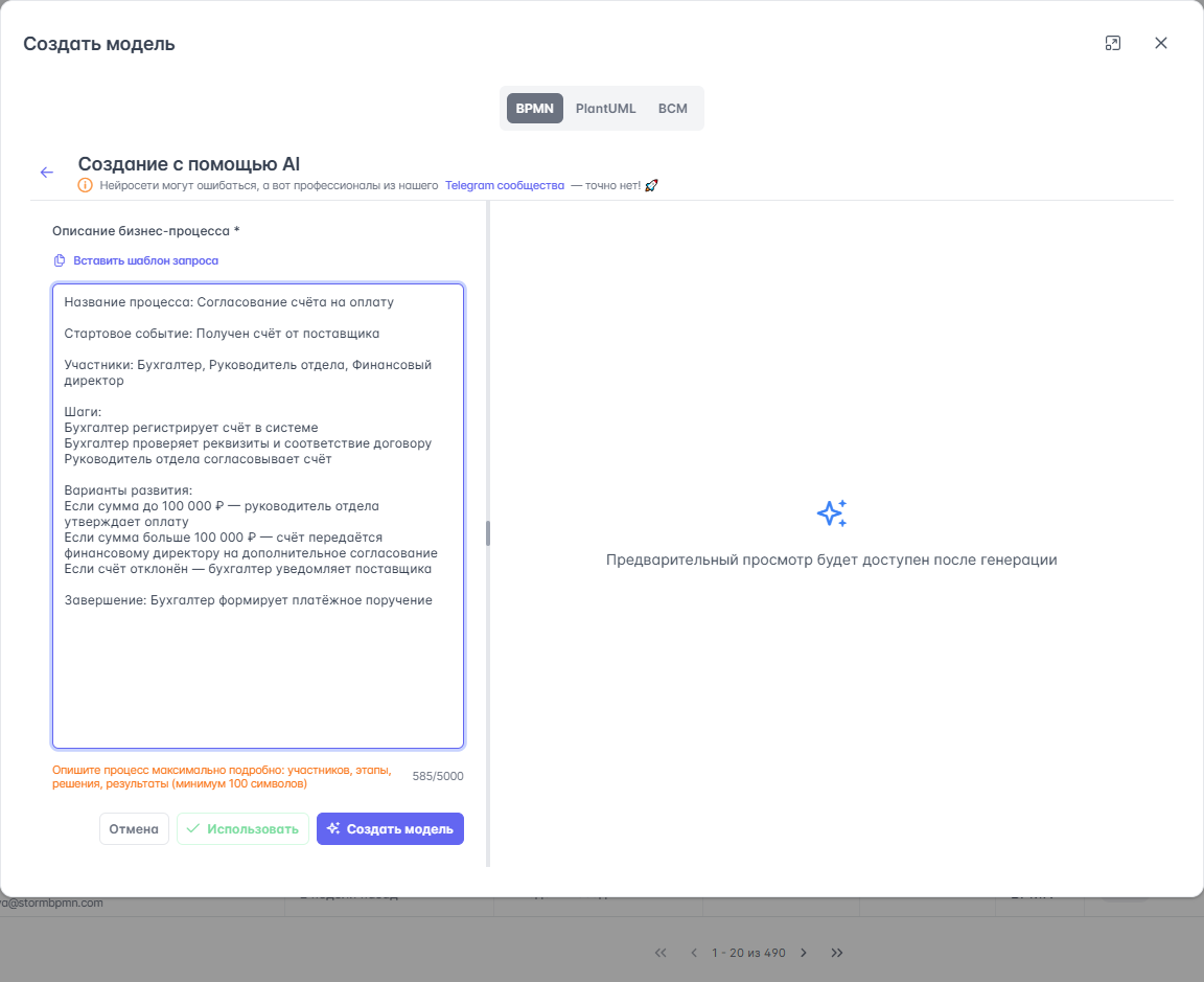 Нажмите кнопку «Создать модель» — AI сгенерирует диаграмму, и вы увидите её предпросмотр справа.
