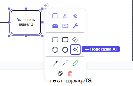 При работе с BPMN-диаграммой вы можете попросить AI подсказать следующий шаг процесса. AI проанализирует уже созданные элементы и предложит логичное продолжение — задачу, развилку или конечное событие.