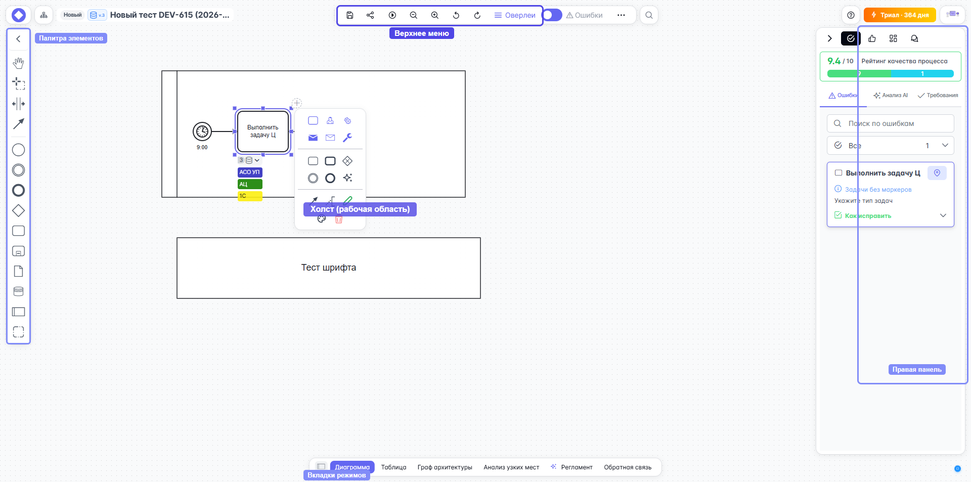 Способ 2: палитра элементов слева. В левой панели собраны все доступные элементы BPMN. Перетащите нужный элемент на холст, а затем соедините его стрелкой вручную — наведите