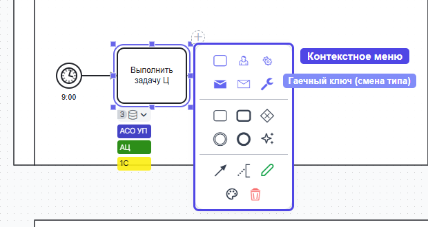 Способ 1: контекстное меню элемента. Нажмите на любой элемент на холсте — справа появится контекстное меню с иконками. Выберите нужный тип: задачу (прямоугольник со скруглёнными углами), шлюз (ромб), событие (круг) или промежуточное событие. Новый элемент автоматически