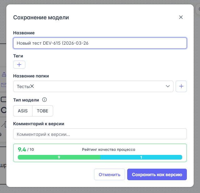 Нажмите Ctrl+S или кнопку «Сохранить» в меню действий (левый верхний угол). Каждое сохранение создаёт версию — вы всегда можете вернуться к предыдущему состоянию через